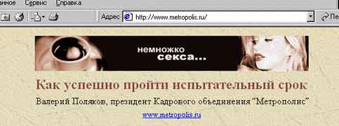 Екатерине Храбровой баннер подсказал способ - как успешно пройти испытательный срок у президента кадрового объединения "Метрополис". Екатерина предложенным способом не воспользовалась, зато поделилась этой тайной с нами. >