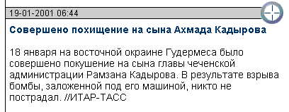 Вот такие дела. Было совершено похищение на сына Ахмада Кадырова. Но бомбу заложили под машину сына Рамзана Кадырова. А сделали они это для того, чтобы испугавшийся бомбы сын Рамзана поведал об этом сыну Ахмада, а тот доложил отцу, и тот, который Ахмад, а не Рамзан, рассказал все Зии Кадырову, чтобы тот припугнул Алисхана Кадырова, а тот все рассказал Опти Кадырову и Аслану Кадырову, после чего Беслан Кадыров и Доку Кадыров сделают для себя соответствующие выводы.
