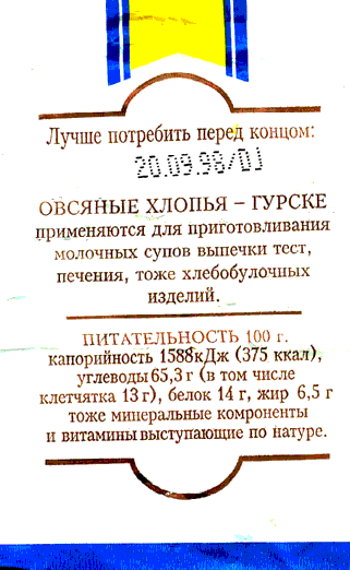 Вы представляете, насколько Андрей был озадачен, прочитав эту ценную информацию? Мало того, что хлопья "ГУРСКЕ" лучше потребить перед концом, а печальный конец у Андрея, надеюсь, весьма далек! Но кроме того, в хлопьях какая-то капорийность, клятчатка, загадочные минеральные комроненты, но главное - витамины выступающие по натуре! Впрочем, я думаю, что там элементарная опечатка, поэтому имелись в виду витамины, выступающие в натуре! То есть берешь ты один хлопчик, а оттуда витамин - КАК ПРЫГНЕТ, да как сунет тебе два растопыренных пальца в нос и скажет: "Ну что, фраер, децл шамовки захотел?".