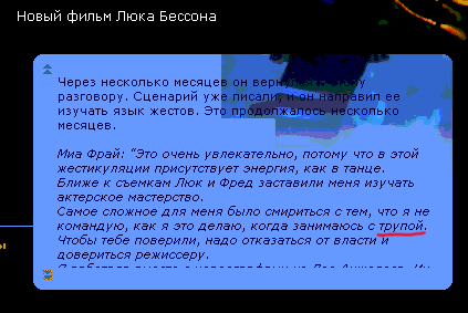 Вот такая она, Миа Фрай, некрофилка. Причем не просто мучает несчастную трупу (я так понял, что это труп женского рода), а еще ею и командует. Правильно Бессон Миу заставил в фильме замолчать. А то черт ее знает, сколько трупов было бы на съемках "Дансера".