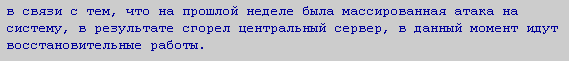 (по секрету) Я так думаю, что хакеры не только зафлудили весь сервак, но еще и флейм там кошмарный развели, из-за чего сервер и погорел, бедолага.