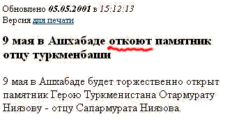Вот и гадай после этого, что именно скрывается за термином "откоют". Может быть, откуют? В смысле, выкуют? Потому что туркменбаши - это отец всех туркмен (интересно, туркмены когда-нибудь догадаются подойти к нему и сказать: "Папа, дай денег"?). А отец отца всех туркмен - дедушка всех туркмен или первая производная от отца. Стоп, это, наверное, отец - первая производная от дедушки... Что-то память слабеть стала. Начал забывать алгебру. И чем же теперь мне поверить гармонию?