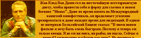 Видали, до чего вегетарианские диеты доводят? Относительно молодой и мускулистый, хотя и туповатый, бельгиец взял и превратился в интеллигентного и довольно немолодого американца, которого весь мир знает под именем Пола Ньюмана. Интересно, что кушал Ван Дамм, дабы превратиться в Пола Ньюмана? Небось, какую-нибудь уругулу. Зато ему теперь платить будут намного больше. Мышцами и балетными па под видом боевых единоборств никого не удивишь - эка невидаль, а вот тонкая психологичность в исполнении сложных ролей - это да. Таких актеров довольно мало. Так что уругула - она очень полезная овощь!