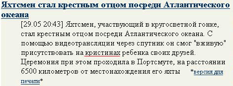- Кристины хихикали и делали вид, что очень смущены, несколько нарушая торжественность церемонии, - как сообщил наш корреспондент, присутствующий при данном событии. - Правда, - добавил он, - поскольку яхтсмен присутствовал на Кристинах чисто виртуально, их девичья честь не пострадала.