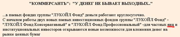 - Мы гарантируем, - подчеркнул директор фонда, - что частные яйца смогут вложиться в любую инвестиционную корзину! Это наш принцип: частным яйцам - широкий инвестиционный простор!