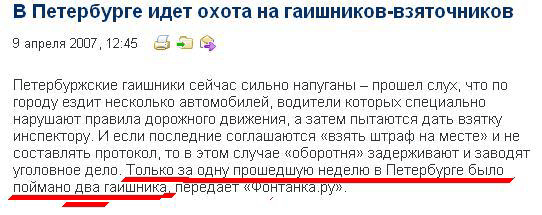 Масштаб борьбы с коррупцией в ГАИ - просто поражает, сообщил Алексей. Недавно их главный начальник заявил, что за прошедший год его подопечные брали взятки только восемь раз. С каждого водителя. А вот теперь за неделю вычислили аж двух взяточников! Ну, дело пошло, однозначно...