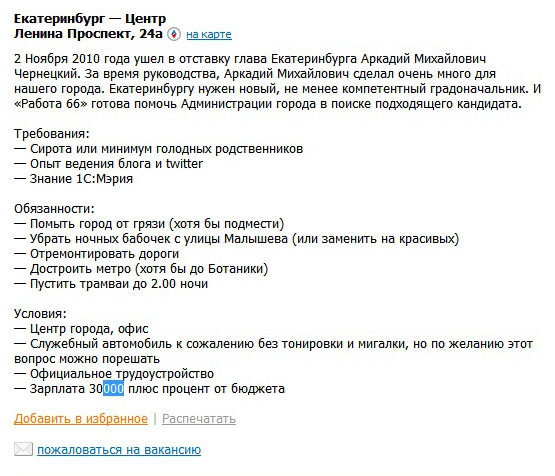 В Екатеринбурге, рассказала Мила, открылась вакансия мэра. Размещена на сайте вакансий.