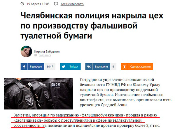 Слава богу, восхищается Александр, что челябинская полиция пресекла преступление в сфере интеллектуальной собственности!