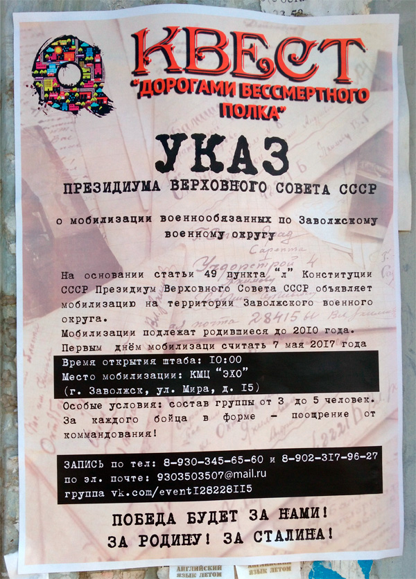 Традиционная для последних лет предпобедная истерия началась, картинки уже поступают. Игорь прислал вот это творчество группы заволжских товарищей, которые семилетних-восьмилетних детей мобилизуют дорогами бессмертного полка - видать до Берлина. Победа будет за ими.