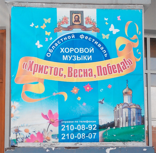 Раньше писали "Любовь, Комсомол и Весна", вздыхает Маргарита. Особенно трогательно смотрится Христос с георгиевской ленточкой. Странно, что на него пилотку со звездой-то не налепили, не додумались.