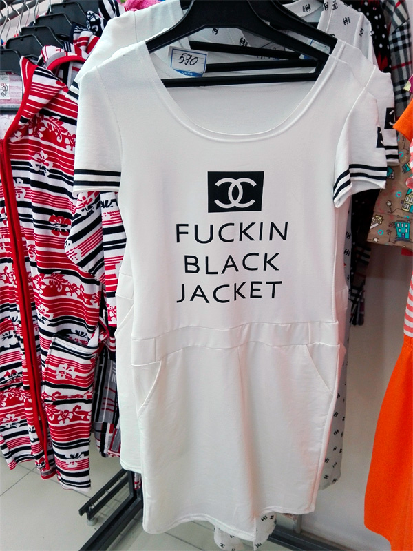 Главное - чтобы на иностранном было написано, уверяет Дмитрий. Когда на иностранном - это же круто. Поэтому любая гламурная девушка почтет за честь надеть жакет, на котором написано "Сраный черный жакет". Правда, слово "сраный" написано с ошибкой, но и жакет-то, между нами, совсем не черный.