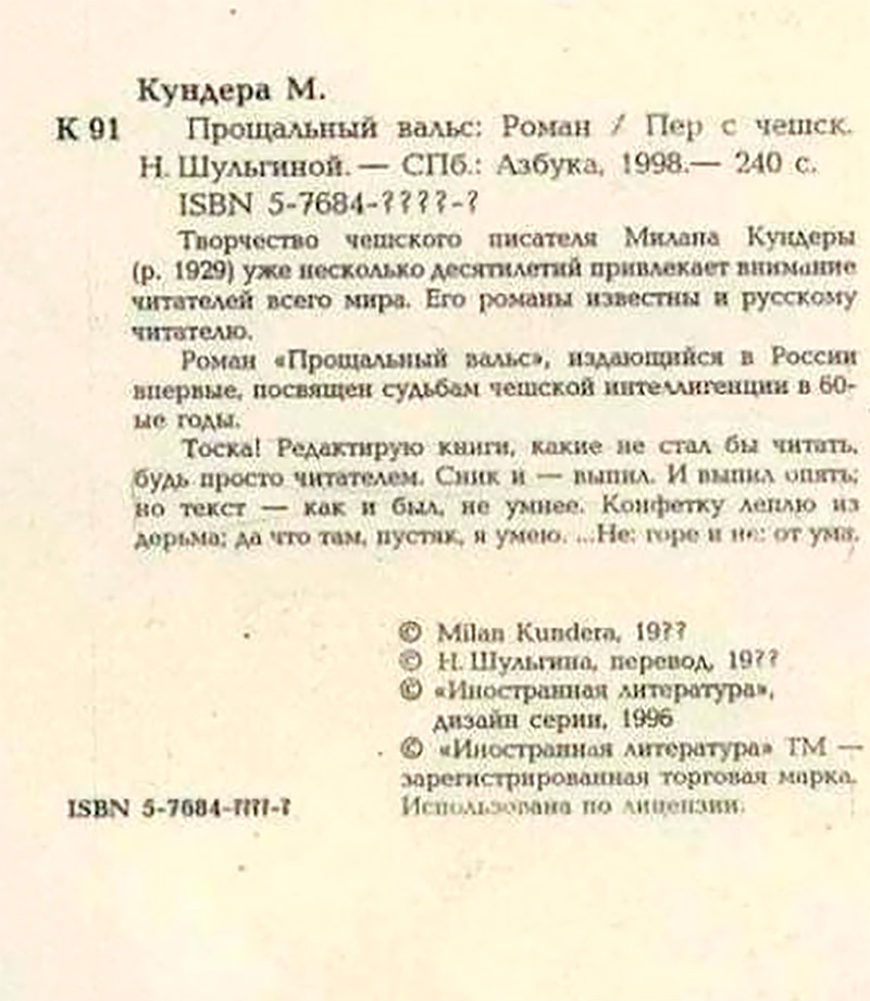 Учитывая, что в выходных данных Кундеры часть ISBN и дат (год издания, перевода) заполнены вопросительными знаками, можно сделать вывод, что это черновая верстка.
