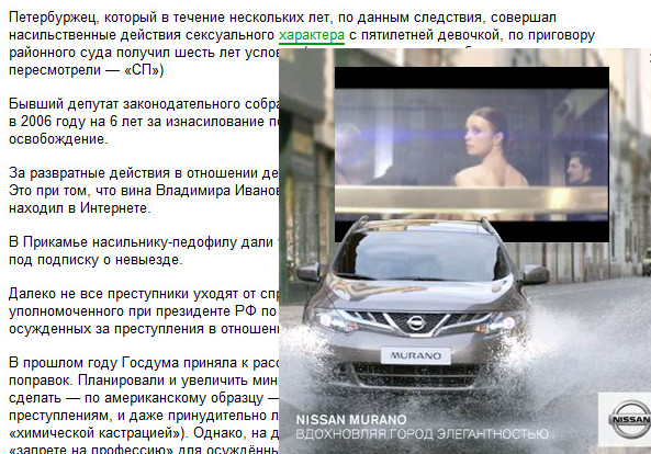 Я не устану повторять примеры этой дебильной контекстной рекламы от "Бегуна" - может, хоть один рекламодатель задумается, как это выглядит. Nissan Murano у нас, например, носит характер действий сексуального плана с маленькими детьми. Вот ему нужна такая реклама, спрашиваем мы с Сергеем?