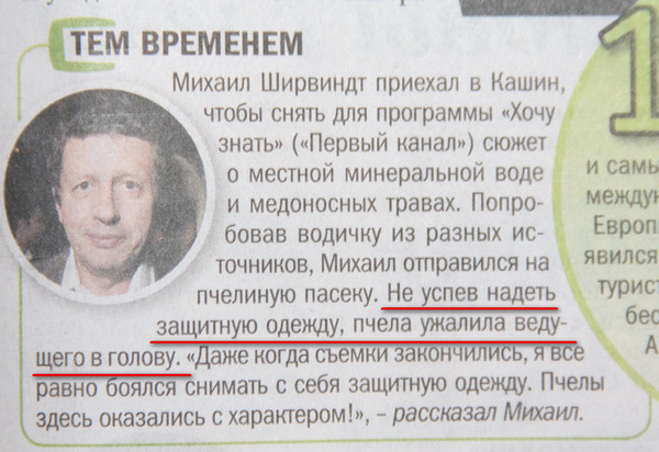 Константин рассказал жуткую историю: несчастная пчела не успела надеть защитную одежду и укусила в голову Михаила Ширвиндта. Насекомое, разумеется, скончалось на месте.
