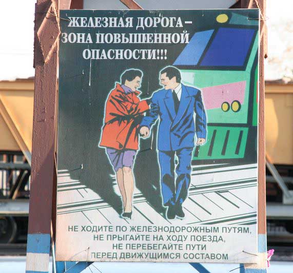 Железная дорога, предупреждает Serg, - зона повышенной опасности! Как ясно видно из плаката, там шляются всякие опасные тетки, которые могут схватить за рукав одинокого мужчину и бросить через бедро прямо под поезд. Как страшно жить!