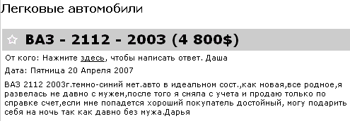 Еще не забудьте, что при покупке машины к ее цене прибавляется $100, если на час, и $300, если за ночь. Утром машину не забудьте вернуть, а то девушка так и останется одинокая. Кому она будет нужна, без машины-то?!!