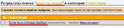Андрей искал музыкальную композицию "Круто ты попал". Строгого соответствия не нашлось, но зато Андрею выдали строжайшее соответствие: