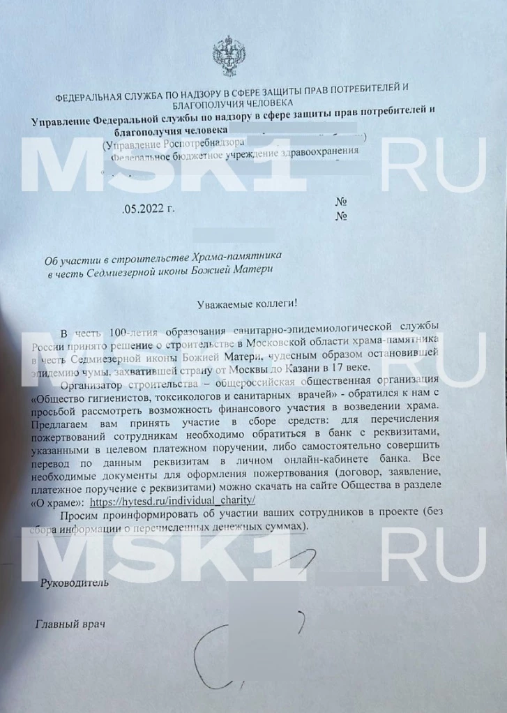 В региональные отделения управлений Роспотребнадзора пришел документ, который предлагает сотрудникам совершить пожертвования в пользу строительства храма в Подмосковье. Как сообщает MSK1.RU, письмо пришло еще в мае, но стало известно о нём только сейчас.