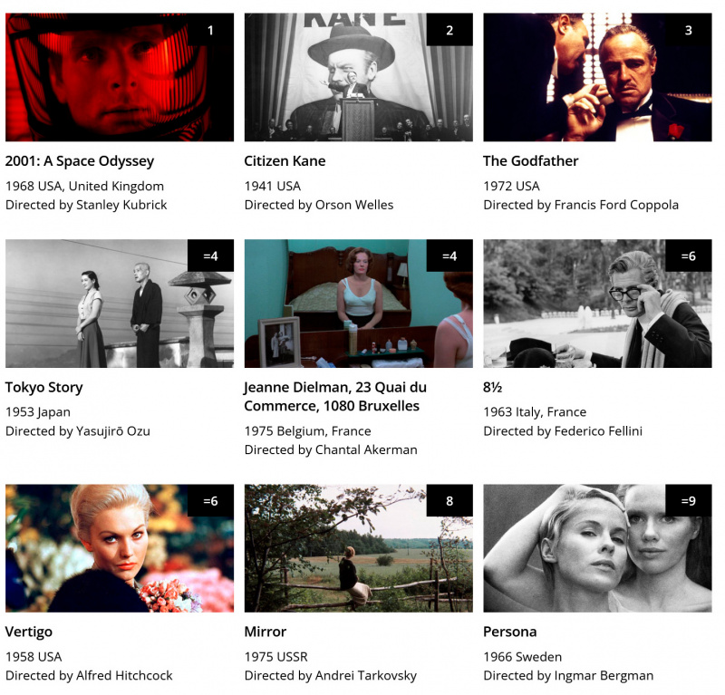 Начиная с 1992 года, каждое десятилетие журнал Sight and Sound дополняет свой список официальным опросом ведущих режиссеров мира о десяти фильмах, которые они считают величайшими в истории. На основании полученных списков составляется список и рейтинг 100 величайших фильмов.