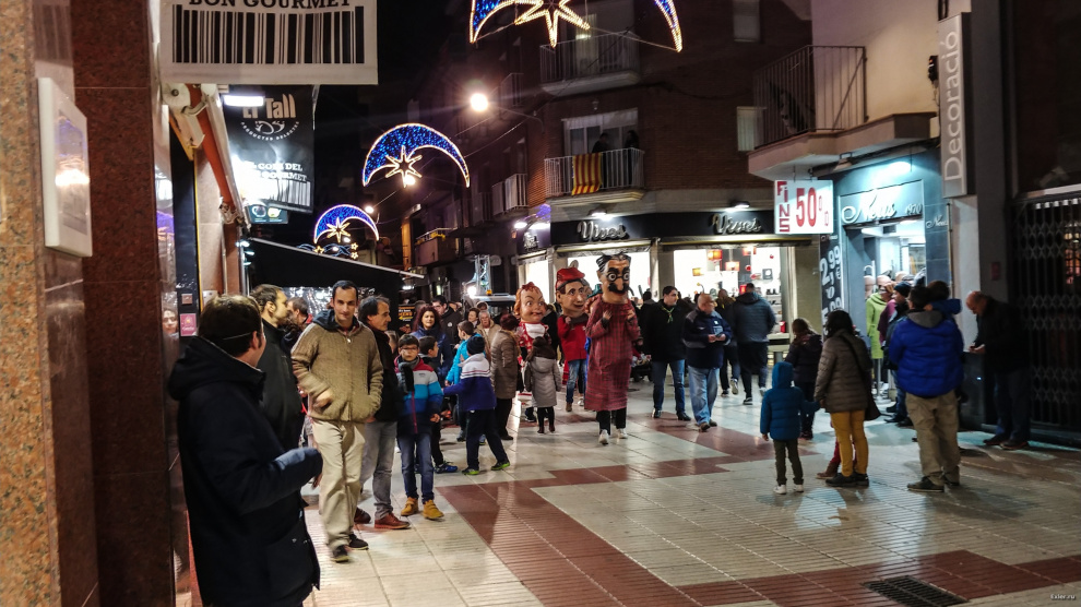 Начинается традиционная процессия - мужик с большим носом едет в повозке и разбрасывает всем носы на резиночке. Его сопровождают маски.