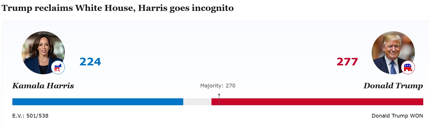 Дональд Трамп, согласно прогнозам, лидирует на выборах президента США. Телеканал Fox News, который поддерживает республиканцев, отдал Трампу 277 голосов выборщиков при необходимых 270, Associated Press и The New York Times — 267, CNN и NBC News — 266. Кандидат от демократов Камала Харрис, согласно прогнозу Fox News, получила 226 голосов выборщиков. AP и NYT отдали ей 214 голосов, CNN — 188, NBC News — 194. (Отсюда.)