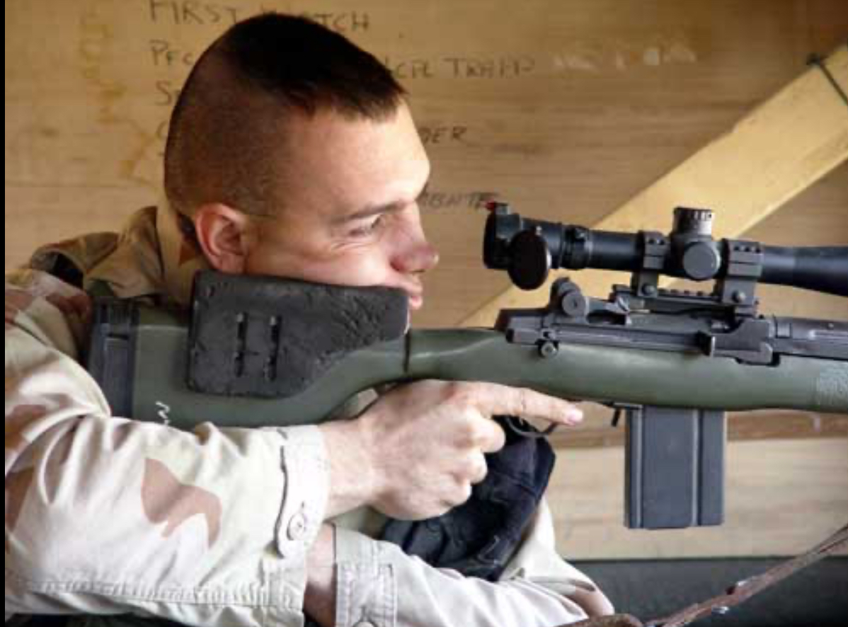 А может и нет, с учетом того, квалификацию он проходил с М1 Гарандом или с М14, и пистолетной рукоятки нет ни у одной ни у другой. 😄