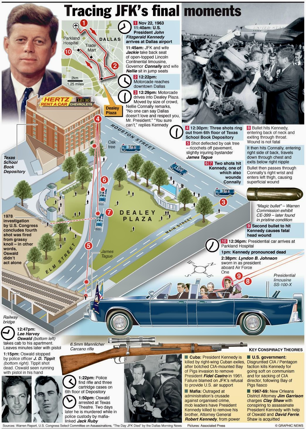 Хроника такова - Освальд убивает президента, через два дня убивают самого Освальда. Его убийца Джек Руби садится в тюрьму и быстро сгорает от рака. Перед смертью даёт интервью журналистке, но она тут же умирает от передоза наркотиков (хотя никогда их не употребляла). Ключевой свидетель Ли Бауэрс, заявивший "из-за ограды стреляли двое" погибает в автокатастрофе. Проститутка Шерами, слышавшая от пьяного офицера ЦРУ "через два дня Кеннеди будет убит", сам агент вешается - потому, что "не стал Джеймсом Бондом" (кстати, перед смертью Кеннеди посмотрел бондиану "Из России с любовью").