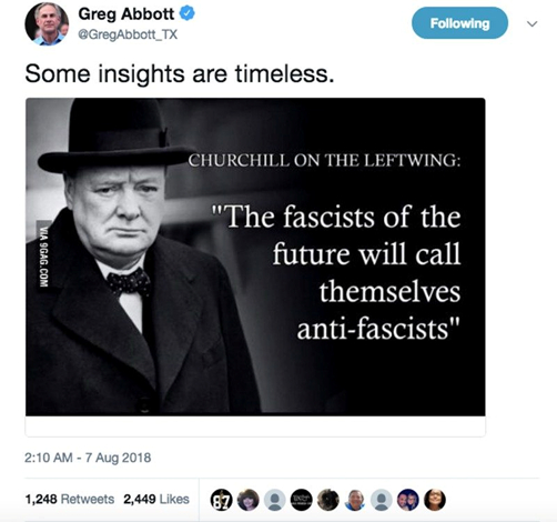 Первые подобные сентенции в англоязычной печати появляются в 1936 году, причём не в Великобритании, а в США. Так, в феврале-марте в газете The Cincinnati Inquirer несколько раз процитировали пресвитерианского пастора Нормана Томаса: «Фашизм, скорее всего, придёт в Соединённые Штаты, но не под этим именем». Одна из статей содержала уточнение: «Этим заявлением он повторил слова покойного Хьюи Лонга, однако Хьюи добавлял: "Конечно, он у нас будет. У нас это будет проходить под маской антифашизма"».