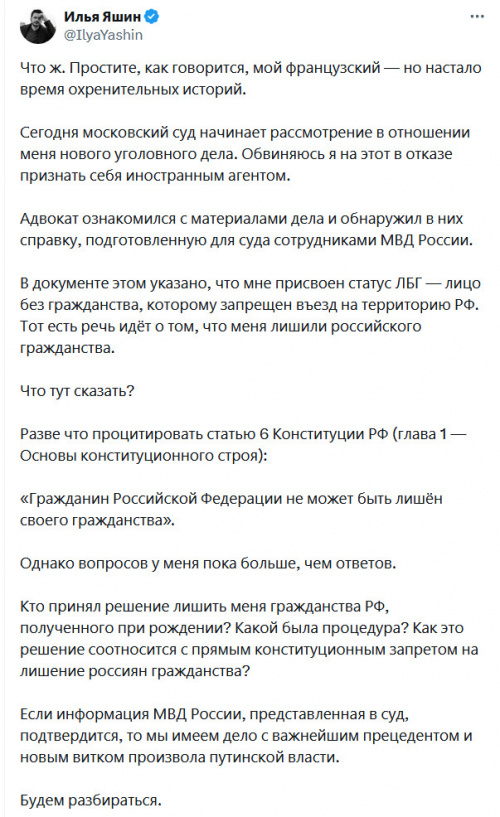 Илья Яшин заявил, что МВД РФ, судя по документам очередного уголовного дела, лишило его российского гражданства. Что прямо запрещено по Конституции РФ, гарантом которой является президент РФ. Впрочем, понятно, что после того, как этот президент РФ изнасиловал Конституцию РФ в особо извращенной форме, этой Конституцией теперь можно только подтереться.