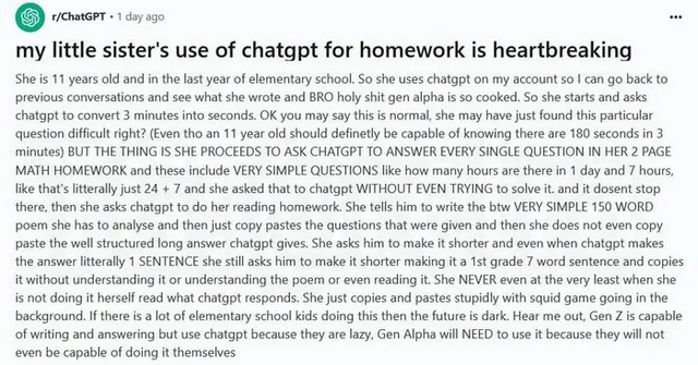 «Ей 11 лет, и она учится в последнем классе начальной школы. Она использует chatgpt на моей учетной записи, поэтому я могу вернуться к предыдущим разговорам и посмотреть, что она написала, и, блин, поколение альфа уже готово. Она начинает и просит chatgpt перевести 3 минуты в секунды. Вы можете сказать, что это нормально, что ей просто показался сложным этот конкретный вопрос, верно? (Хотя 11-летний ребенок определенно должен знать, что в 3 минутах 180 секунд) НО ДЕЛО В ТОМ, ЧТО ОНА ПРОДОЛЖАЕТ ПРОСИТЬ CHATGPT ОТВЕЧАТЬ НА КАЖДЫЙ ВОПРОС В ЕЕ 2-СТРАНИЧНОЙ ДОМАШНЕЙ РАБОТЕ, и среди них есть ОЧЕНЬ ПРОСТЫЕ ВОПРОСЫ, такие как сколько часов в 1 дне и 7 часах, то есть буквально 24 + 7, и она спросила об этом chatgpt, ДАЖЕ НЕ ПОПЫТАВШИСЬ решить это сама.