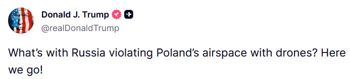 Трамп проснулся, и ему доложили о российских дронах, которые вторглись в Польшу.