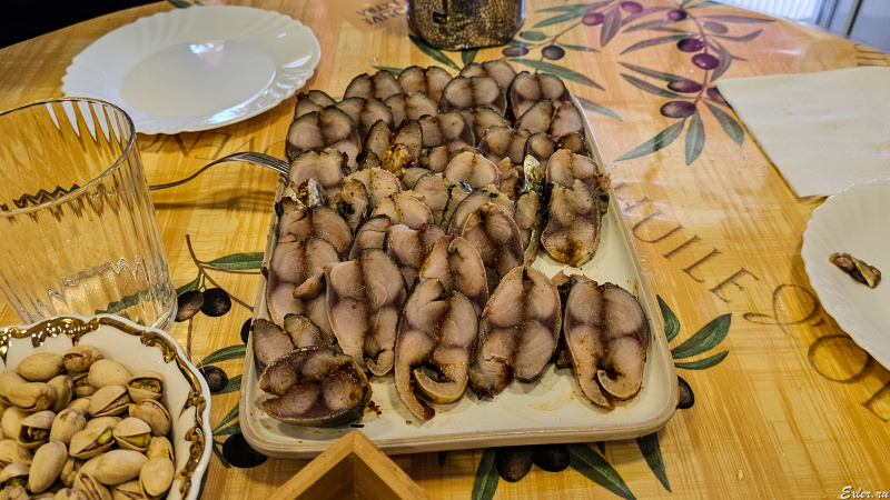 Don Simon принес норвежскую скумбрию, которую он сделал очень интересным образом: рыба копченая, без костей, со всякими специями. Получилось очень вкусно.