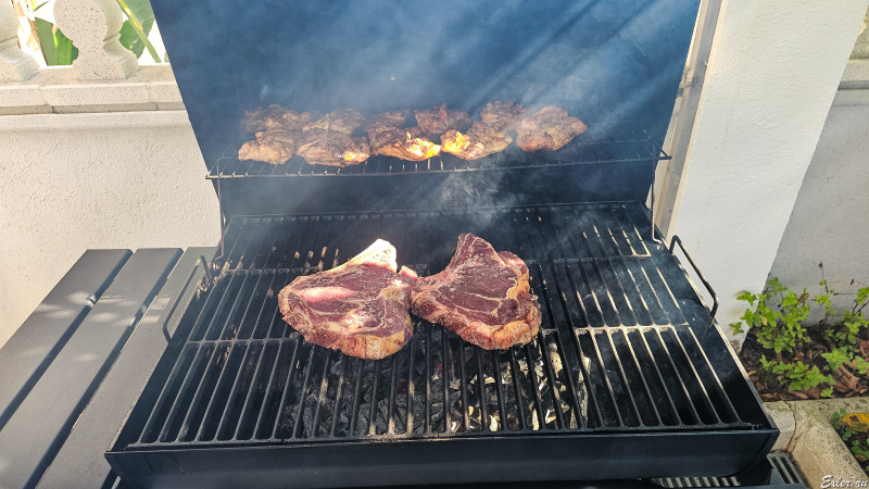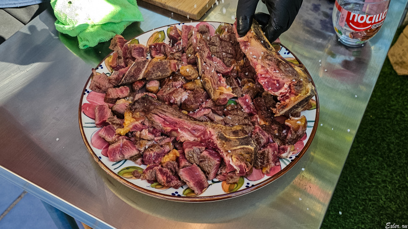 Серхио чулетоны жарит до уровня Rare, режет на кусочки, на стол ставится специальная жаровня, куда засыпается раскаленный уголь из гриля, и каждый себе сам дожаривает куски до нужной прожарки. В наших краях в некоторых хороших ресторанах так подают чулетоны.