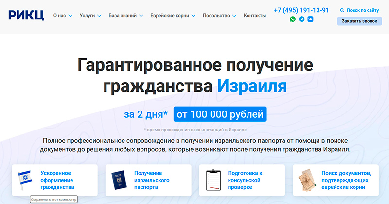 Вы знаете, например, что собеседование у консула проходят с первого раза только 20% претендентов? А среди клиентов РИКЦ это получается сразу у 99%! В этом и заключается профессионализм: за 10 лет работы РИКЦ израильские паспорта с их помощью получили более 8 000 семей, так что их эксперты уже сталкивались со всеми возможными трудностями и знают правильные ответы на любые каверзные вопросы.