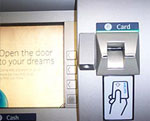 Штука известная - на обычный банкомат надевается устройство, которое считывает вашу карточку. Пин-код или снимается фальшивой клавиатурой, или подсматривается с помощью расположенной поблизости мини-камеры. После этого в течение пары часов все ваши денежки с карточки улетают. Вот здесь - подробное изложение одной из схем (скиммер и накладная клавиатура) с весьма познавательными фотографиями. Будьте осторожны!