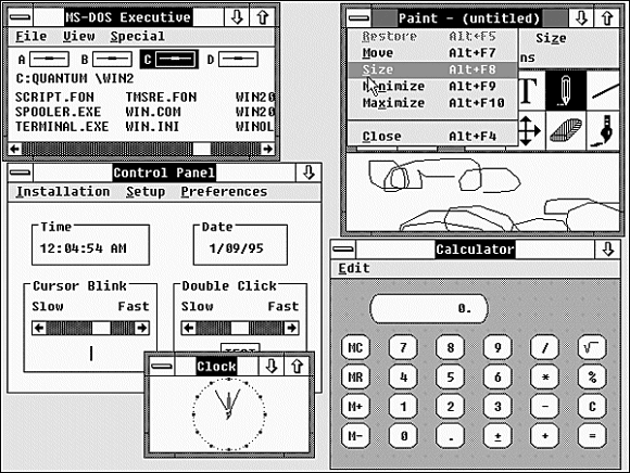 Забавный ролик, в котором представлены все десктопы Windows, включая всякие беты, сопровождаемые звуками загрузочной заставки. Ностальгия, понимаешь. У меня фирменный Windows 2.0 был на пятидюймовых дискетах: то ли десяти, то ли пятнадцати - я уже не помню. Дистрибутив подарил один американец. На вопрос, что это такое, он ответил, что сам не знает, но раз на таком количестве дискет - значит, крутотень. Я ее тогда на свою 286-ю полдня устанавливал. Заняла эту штука половину винта, так что полюбовавшись с полчасика на графический калькулятор и блокнот, я ее снес. Вот так эта штука тогда выглядела.