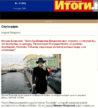 Интервью с Боярским в очередных "Итогах" является практически темой номера - Боярский вынесен аж на обложку. А само интервью оставляет довольно гаденькое впечатление. Наш дорогой д'Артаньян нынче превратился в мелкого холуйчика, который своим холуйством даже гордится. При этом он почему-то не стесняется одновременно говорить о какой-то непонятной чести и каком-то несуществующем благородстве. И еще - умора! - называет себя дворянином. Но зато он в своем театрике уверен - не отберут. Пока по крайней мере он так нежно и нижепоясазацеловывающе любит Царя Батюшку и готов по первому зову хоть куда, пока он в любой момент готов выбежать на площадь и во все места облобызать дорогую Губернаторшу Матушку, за театрик он особо не переживает - Царь Батюшка и Губернаторша Матушка в обиду-то своего царева человечка не дадут. Тьфу, противно...
