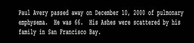 Перевожу. Пол Айвори скончался 10 декабря 2000 года от легочной эмфиземы. Ему было 66 лет. Его прах родные развеяли над заливом Сан-Франциско.