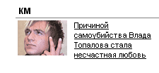 Мне стало даже интересно, ведь понятно, что никакой Топалов не самоубивался. Ведет баннер, как водится, на морду КМ.ру, где нет никаких упоминаний ни о Топалове, ни о самоубийстве. На всякий случай попробовал поискать по сайту - просто из интереса, чтобы понять, что они имеют в виду. Не нашел ничего.