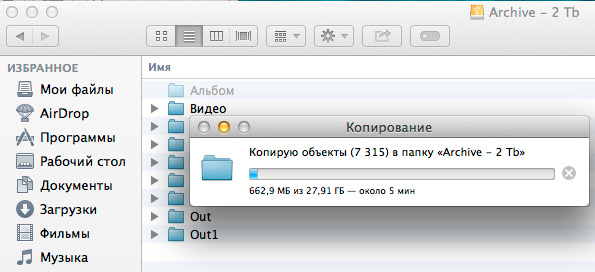А главное - реальная скорость перекачки больших объемов с OS X на диск NTFS у меня получалась порядка 6 Гб в минуту! Это очень здорово, у меня на компьютере под Windows скорость меньше - порядка 5 Гб в минуту.