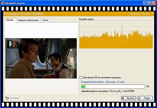 Процессор при этом был нагружен процентов на 50 (FairUse Wizard, которым я раньше пользовался, в тех же условиях загружал процентов на 75 и работал заметно дольше), а чисто визуально пашущая в фоне CloneDVDMobile на остальной работе вообще никак не отражалась. Я даже ради хохмы запустил параллельно тот же FairUse Wizard, и они вдвоем нагрузили процессор почти на 100% - и тем не менее остальные программы (почтовый клиент, браузер, файловый менеджер, графический редактор) работали вполне нормально и тормоза практически не замечались.