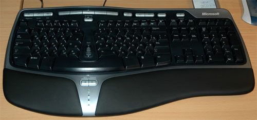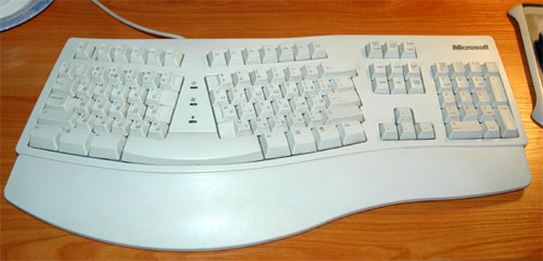 Бежать в магазин за новой мне не сильно хотелось, тем более что эргономичные клавы продаются вовсе не на каждом углу, и я вытащил из загашника давно снятую с производства Microsoft Natural Keyboard, которую спрятал, потому что со стратегической точки зрения нужно было привыкать к MS 4000. Вот она, эта прелес-с-с-сть: