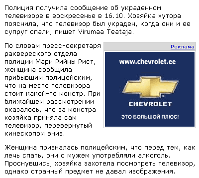 Вообще да, жуткое дело. Вот так просыпаешься, а вместо телевизора - какой-то монстр! Но полицию вызывать при этом не следует. Нужно просто снова лечь спать и понадеяться, что под утро монстр окажется обычным телевизором, которого кто-то с бодуна поставил кинескопом вниз.