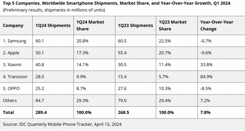 Рынок смартфонов постоянно меняется, и те компании, которые вчера считались безоговорочными лидерами, могут уступать свои позиции - что и продемонстрировала компания Apple, которая по данным исследования International Data Corporation (IDC) Worldwide Quarterly Mobile Phone Tracker, в первом квартале 2024 года уступила лидерство компании Samsung по продажам смартфонов.
