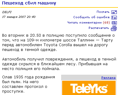 Совсем недавно в Прибалтике один мужик на "Бентли" врезался в другую машину в канаве. Нашел, понимаешь, место. А теперь еще круче: загадочный пьяный пешеход сбил машину.