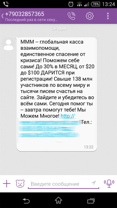 Upd2: А в Viber продолжает валиться спам от МММ. Вот только что опять пришло. Чувствую, загадят они этим делом Viber не по-детски.