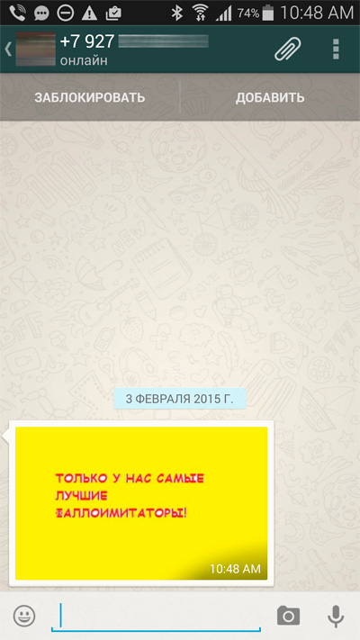 Вы думаете, такое возможно только в Viber? Ха-ха. Пожалуйста - WhatsApp. "Спам" (для теста) с незнакомого номера.
