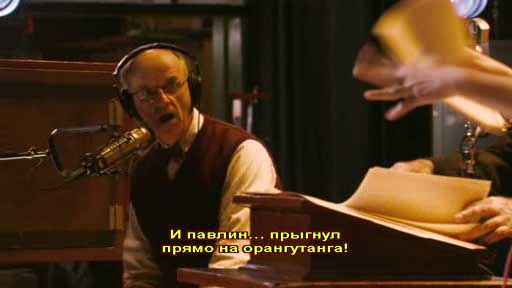 Ведущий живого радиошоу теряет бумажку с текстом и начинает импровизировать на тему рекламы клейкой ленты. Остальные члены труппы ему помогают. Рядом с ведущим стоит звукоимитатор, который создает соответствующие звуковые эффекты. Так вот, импровизация звукоимитатора ставит в довольно затруднительные положения, но он с честью из них выходит. Сцена - просто блеск, мы с Бубликом обхохотались. Я ее привожу в оригинале с наложенными русскими субтитрами.