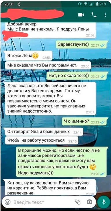 Мне друг-переводчик периодически рассказывает. Звонит ему какая-нибудь бывшая одноклассница, которую он лет -цать не видел и не слышал, и просит перевести с десяток страничек текста. Когда он озвучивает цену, одноклассница страшно оскорбляется: как же так, ведь мы же одноклассники, а там всего десять страничек?!! Неужели трудно бесплатно перевести?!!