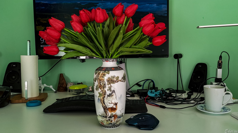 На сайте оценить размер несколько сложно - вот фото для оценки масштабов. Ваза достаточно небольшая (26 сантиметров в высоту), но очень качественная: вживую выглядит даже лучше, чем на сайте продавца. И она отлично подошла для искусственных тюльпанов, которые выглядят как настоящие, только они намного лучше, потому что не скукоживаются и не помирают, а настроение создают. Раньше они у меня стояли в пивной кружке, но это позорище какое-то, зато теперь - в красивой вазе.